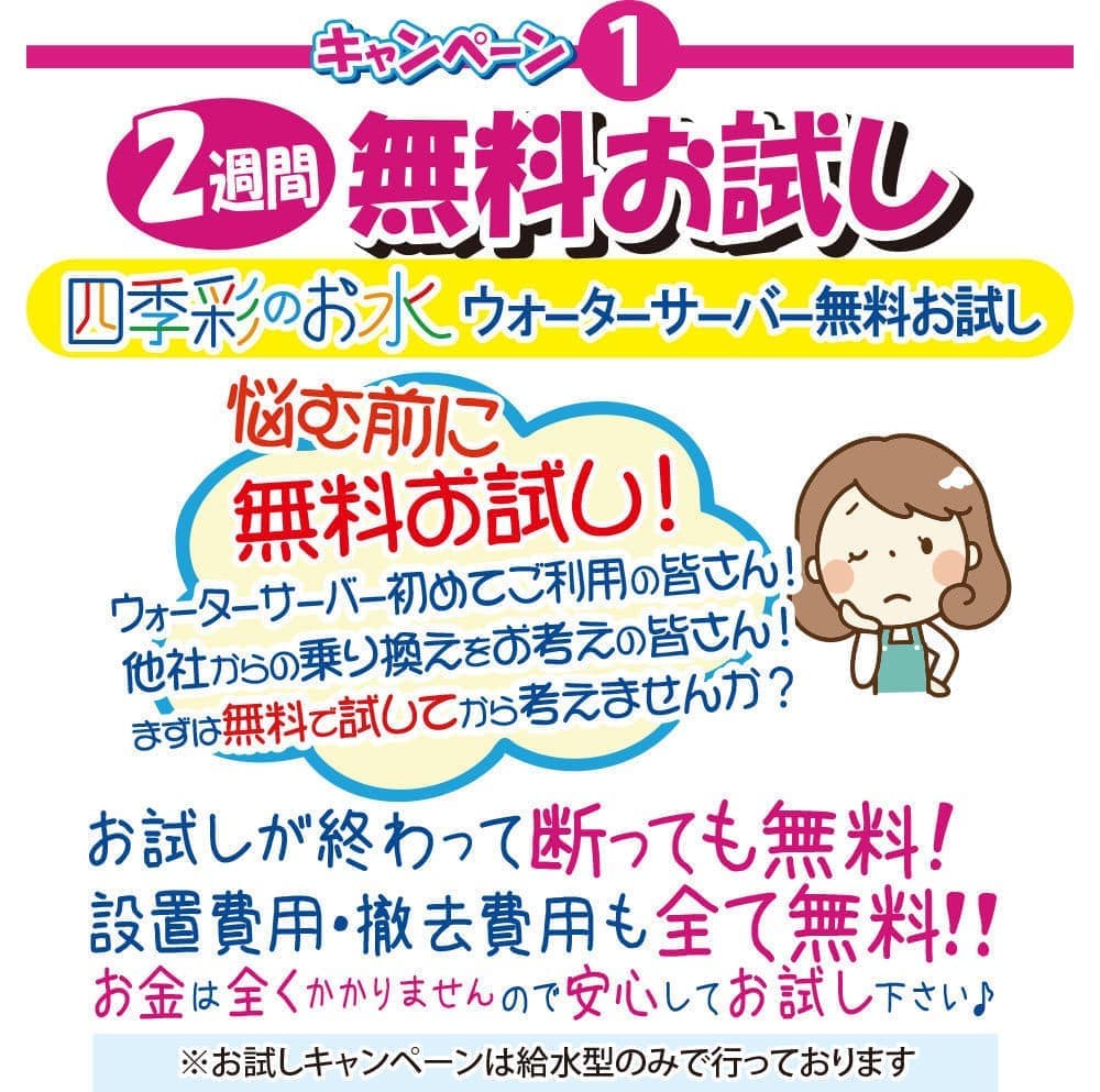 また、ウォーターサーバー導入にかかる一切の費用は頂きません。いかなる追加費用も一切ありません。